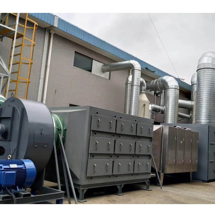 (2)等離子法:等離子法是利用高壓電極發(fā)射離子及電子,破壞惡臭分子結構的原理,轟擊廢氣中惡臭分子,從而裂解惡臭分子,對低濃度的惡臭氣體凈化效果明顯,在正常運行情況下可達到80%以上,能處理多種臭氣充分組成的混合氣體,不受濕度的影響,且無二次污染